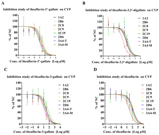 Inhibition of eight CYP enzymes by theaflavin derivatives in pooled HLMs. (A) Theaflavin-3′-gallate. (B) Theaflavin-3,3′-digallate. (C) Theaflavin-3-gallate. (D) Theaflavin. Each panel shows the effects on CYP1A2, CYP2B6, CYP2C8, CYP2C9, CYP2C19, CYP2D6, CYP3A4-T, and CYP3A4-M. Specifically, the abbreviations 1A2, 2B6, 2C8, 2C9, 2C19, 2D6, 3A4-T, and 3A4-M refer to CYP1A2, CYP2B6, CYP2C8, CYP2C9, CYP2C19, CYP2D6, CYP3A4-T, and CYP3A4-M, respectively. Results are expressed as mean values ± standard deviation (n = 3).