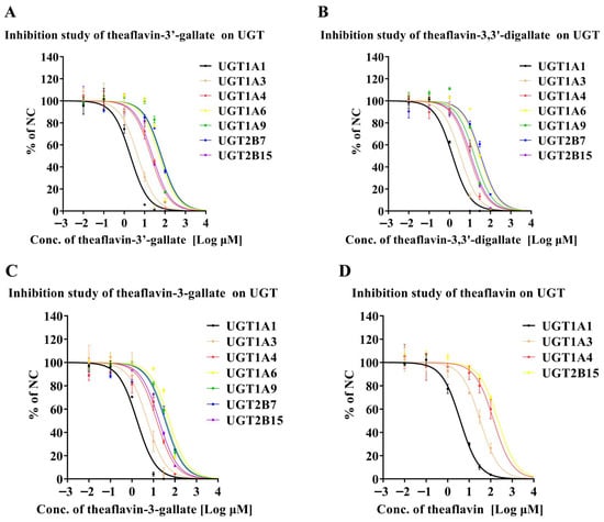 Inhibition of UGT enzymes by theaflavin derivatives in pooled HLMs. (A) Theaflavin-3′-gallate inhibits seven UGT enzymes: UGT1A1, UGT1A3, UGT1A4, UGT1A6, UGT1A9, UGT2B7, and UGT2B15. (B) Theaflavin-3,3′-digallate inhibits seven UGT enzymes: UGT1A1, UGT1A3, UGT1A4, UGT1A6, UGT1A9, UGT2B7, and UGT2B15. (C) Theaflavin-3-gallate inhibits seven UGT enzymes: UGT1A1, UGT1A3, UGT1A4, UGT1A6, UGT1A9, UGT2B7, and UGT2B15. (D) Theaflavin suppresses the functions of four UGT enzymes: UGT1A1, UGT1A3, UGT1A4, and UGT2B15. Results are expressed as mean values ± standard deviation (n = 3).