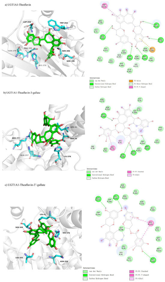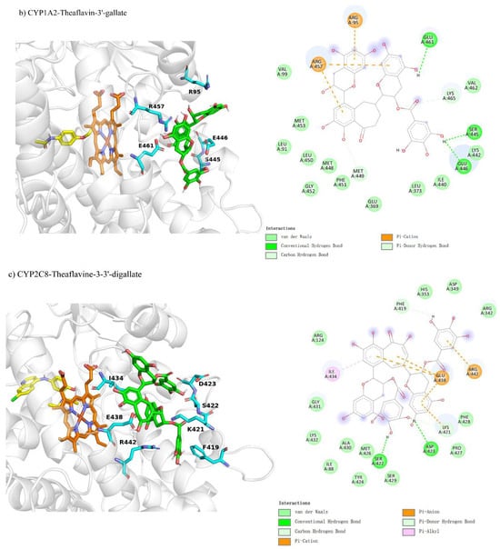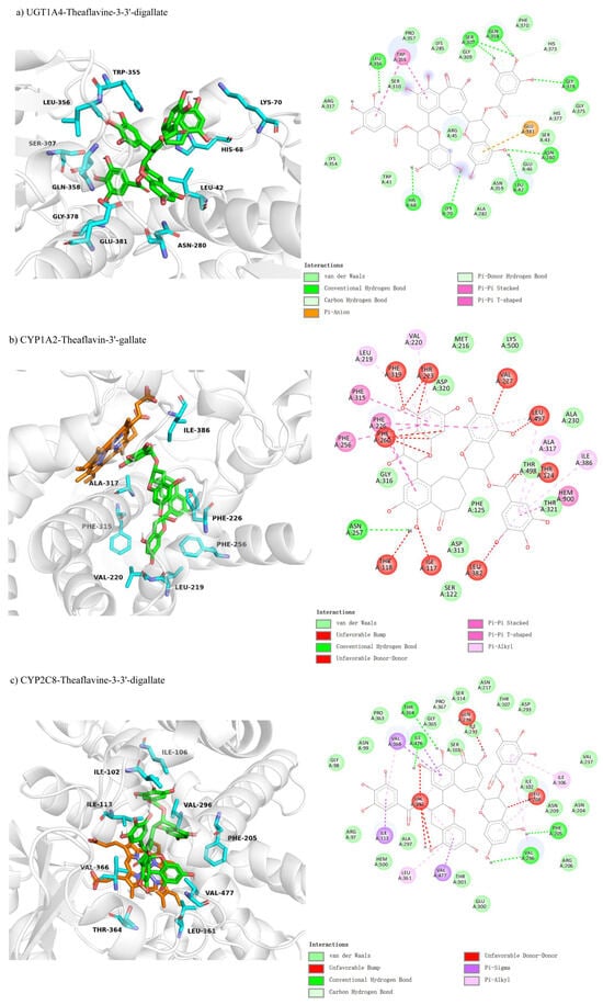 Comparison of molecular docking of UGT1A4, CYP1A2, and CYP2C8 with theaflavin and its isomers under non-competitive inhibition conditions: (a) UGT1A4-theaflavin-3,3′-gallate interaction; (b) CYP1A2-theaflavin-3′-gallate interaction; (c) CYP2C8-theaflavin-3,3′-digallate interaction.