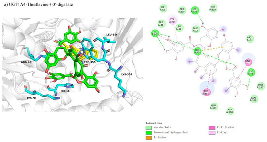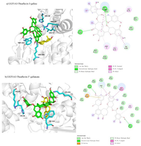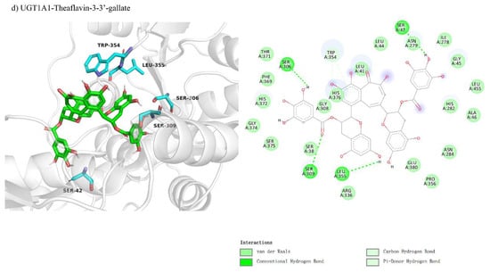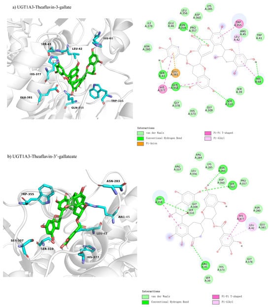 Molecular docking was used to investigate the non-competitive inhibition interactions between UGT1A3 and various theaflavin derivatives. For UGT1A3-theaflavin-3-gallate (Figure 7a), 10 residues interacted with the ligand, forming two hydrogen bond pairs and four π-interactions, resulting in a binding free energy of −7.0 kcal/mol (Table 3). UGT1A3-theaflavin-3′-gallate (Figure 7b) involved 18 residues with two hydrogen bond pairs, three π-interactions, and additional interactions with the original substrate, resulting in a binding energy of −7.7 kcal/mol. UGT1A3-theaflavin-3,3′-gallate (Figure 7c) showed interactions with 19 residues, including nine hydrogen bond pairs and three π-interactions, leading to a binding energy of −8.3 kcal/mol. The increased binding strength with more gallate groups suggests that hydrogen bonding and π-interactions play significant roles in stabilizing the enzyme-ligand complexes.