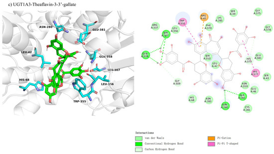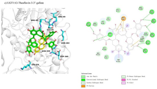Comparison of molecular docking of UGT1A3 with theaflavin and its isomers under non-competitive inhibition conditions: (a) UGT1A3-theaflavin-3-gallate interaction; (b) UGT1A3-theaflavin-3′-gallate interaction; (c) UGT1A3-theaflavin-3,3′-gallate interaction.