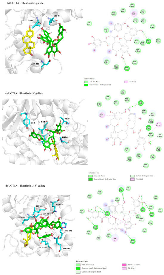 Comparison of molecular docking of UGT1A1 with theaflavin and its isomers under non-competitive inhibition conditions: (a) UGT1A1-theaflavin interaction; (b) UGT1A1-theaflavin-3-gallate interaction; (c) UGT1A1-theaflavin-3′-gallate interaction; (d) UGT1A1-theaflavin-3,3′-gallate interaction.