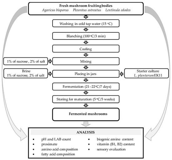 The fermentation procedure followed that used in a previous study [19] with some modifications. A. bisporus and L. edodes fruiting bodies with a diameter of 3.5–4.5 cm and short-trimmed stipes were used in the fermentation process. The mushrooms were cleaned thoroughly to remove substratum debris and rinsed in cold tap water with a temperature of approximately 15 °C. The A. bisporus and L. edodes mushrooms were left whole, while the P. ostreatus mushrooms with a diameter above 4 cm were cut in half with a knife. Next, the mushrooms were subjected to blanching in boiling water for 3 min. When cooled, 2% (w/w) NaCl and 1% (w/w) sucrose were added to the samples. The mushrooms were divided into 380 g portions and transferred into 500 mL glass jars. Then, 120 mL of a solution containing 2% NaCl and 1% sucrose was added. Afterwards, the starter culture (L. plantarum EK11) was inoculated with 107 CFU (colony-forming unit) per gram of fermented material and the jars were closed. The initial value of pH was approximately 6.7. The lactic fermentation was maintained for 7 days at 21–22 °C, after which the fermented mushrooms were stored in the same sealed intact jars at 5 °C for 5 weeks for maturation. The fermentation process was performed in triplicate. The samples of fresh and fermented mushrooms were stored at −80 °C until the basic components: fatty acids, amino acids, biogenic amines, and vitamins were determined. The other analyses were performed on an ongoing basis. A diagram illustrating the research process is shown in Figure 1.