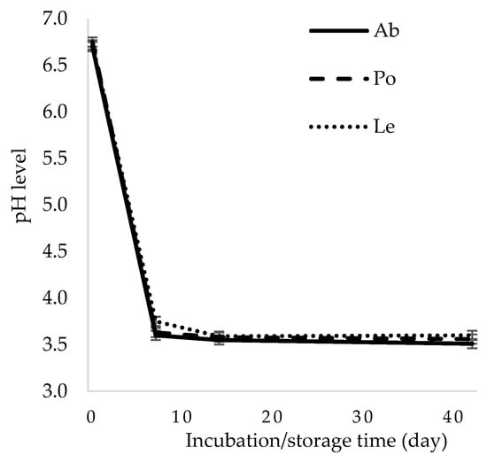 Changes in the pH value in the fermented mushrooms. Ab—Agaricus bisporus, Po—Pleurotus ostreatus, Le—Lentinula edodes.