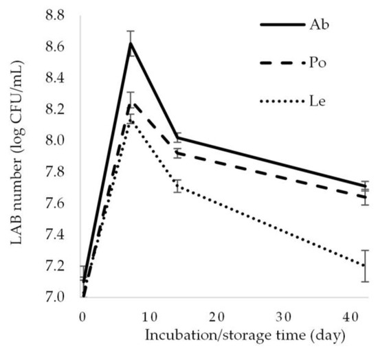 Changes in the LAB count in the fermented mushrooms. Ab—Agaricus bisporus, Po—Pleurotus ostreatus, Le—Lentinula edodes.