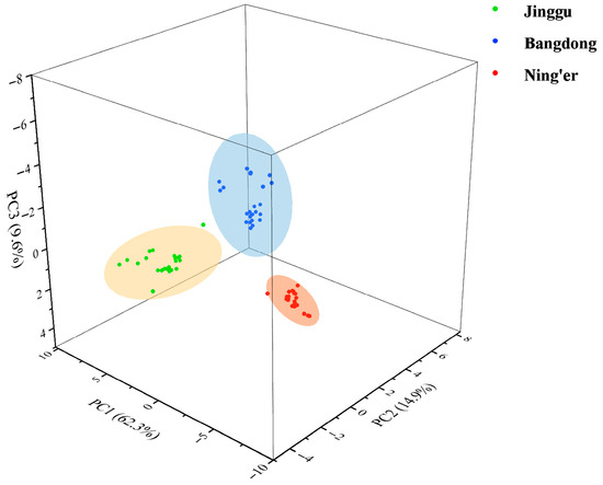 The mean values and standard deviations (SD) of the mineral element contents in tea samples from different origins are shown in Table 2. Except for Cu, As, and Pb, all measured elements showed significant differences among the three geographical origins. Among them, Li showed a significant difference (p < 0.05), while the remaining 24 elements were highly significant (p < 0.01). It is worth noting that Zn was significantly lower in Jinggu compared with other regions, while for Cs, the significance was driven by lower concentrations in Ning’er compared to the other two regions (Table 2). Each origin exhibited distinct elemental profiles. Tea from Jinggu was particularly rich in Li, Sc, Y, Nd, Sm, Eu, Gd, Tb, Dy, Ho, Er, Tm, Yb, and Lu. In contrast, the concentrations of K, Ca, Fe, Co, Rb, Sr, Cd, Cs, Ba, La, and Pb were highest in tea sourced from Bangdong.