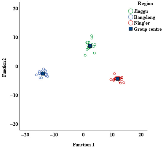 In this model, the original correct discrimination rate reached 100%. The cross-validation results show that the classification accuracy for samples from Bangdong (24/24) and Ning’er (24/24) was 100%, while the classification accuracy for the Jinggu region was 95.8% (23/24), resulting in an overall classification accuracy of 98.6% (71/72). This indicates that the model constructed from these eleven elements can accurately distinguish the tea samples.