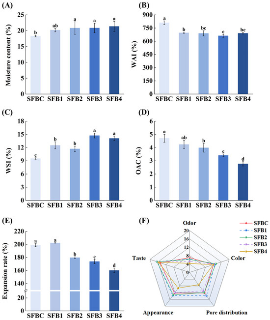 Effect of various proportions of surimi addition on the moisture content (A), WAI (B), WSI (C), OAC (D), expansion rate (E), and sensory evaluation (F) of extruded SFB. Values are presented as mean ± SD (n = 3). Different lowercase letters in the same column indicate significant differences (p < 0.05).
