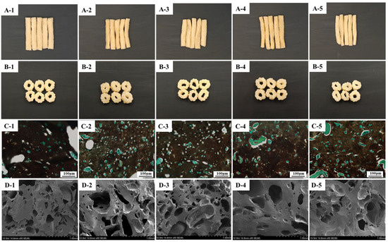 The apparent shape and cross-section of the different extruded SFB samples are shown in Figure 2A,B. The SFBC and SFB1 groups were in an objective puffed state with thick and elastic body walls, which was consistent with the expansion rate results (Figure 1E). When the amount of surimi added exceeded 20% in extruded SFB samples, the surface was not plump, and the body wall became thin; therefore, the status of the products gradually declined.