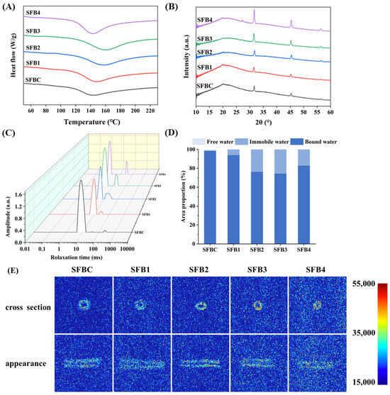 The DSC (A), XRD (B), LF-NMR relaxation time curves and peak areas proportion (C), relative content of different water states (D), and pseudo-color images (E) of extruded SFB with various proportions of surimi addition.