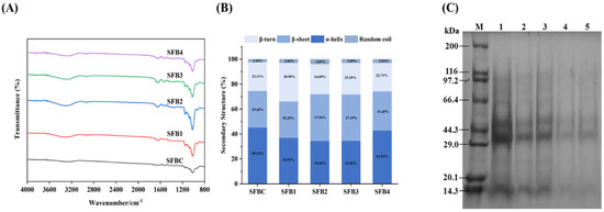 The FTIR (A), secondary structure (B), and SDS–PAGE (C) of extruded SFB with various proportions of surimi addition. Note: Different lowercase letters in the figure indicate significant differences (p < 0.05). The vertical line represents the standard deviation (n = 3); M represents the protein marker, 1 for SFBC, 2 for SFB1, 3 for SFB2, 4 for SFB3, and 5 for SFB4.