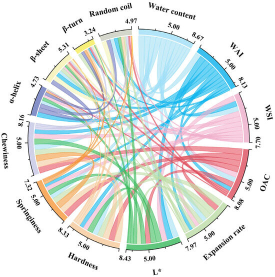 To further reveal the influence of each indicator on the quality characteristics of extruded SFB samples, we prepared a correlation chord plot, as presented in Figure 5. Each node in the chart represents an indicator area, where the scale on each node indicates the magnitude of the relationship strength between that indicator and others. Additionally, the width of the connecting chords reflects the strength of the correlation between two corresponding indicators. In descending order of relationship strength values, the indicators that had the greatest influence on the extruded SFB were moisture content (8.67), L* (8.43), hardness (8.33), chewiness (8.16), WAI (8.13), and OHC (8.08). As shown in Figure 5, the moisture content exhibited a significant negative correlation with the WAI (r = −0.93, p < 0.05). On the one hand, when the moisture content increased beyond a certain threshold, excess water occupied voids or active sites that could adsorb additional water molecules, thus reducing the water-absorbing capacity of the surimi–flour mixed system and lowering the WAI results. On the other hand, high moisture might transform the physical structure of the SFB, diminishing its ability to bind water and consequently lowering the WAI. The moisture content synchronously positively correlated with the WSI (r = 0.86), indicating that the dissolution of substances increased with increasing diffusion and solvation of solute molecules. Furthermore, the expansion rate significantly positively correlated with the OHC (r = 0.93, p < 0.05), indicating that the expansion process might induce conformational changes in macromolecules, such as proteins and polysaccharides. These groups exhibited higher affinity for lipid molecules, enabling stronger oil binding and thus improving the oil-holding capacity. L* was strongly negatively correlated with moisture content (r = −0.98, p < 0.01), implying that as the moisture content increased, the brightness decreased. This phenomenon might result from moisture altering the light scattering and absorption properties within the system. Excessive moisture can increase diffuse reflection inside the food matrix, reducing surface reflectance intensity and hence lowering brightness [12]. Hardness, elasticity, and chewiness are strongly interrelated, which can be explained by their shared dependence on the internal structure and intermolecular interactions within the extruded SFB. A tight network structure typically leads to corresponding changes in these textural properties. There is a complex interplay among α-helix, β-sheet, β-turn, and random coil structures. β-sheets were positively correlated with random coils (r = 0.71) but negatively correlated with α-helices (r = −0.61). This occurred because the formation of protein secondary structures is governed by amino acid sequences and both intra- and intermolecular interactions. Different secondary structures compete during formation; an increase in one structure often restricts the development of another, resulting in specific correlations between them.