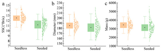 The statistical results for the SSC, diameter, and mass of the seedless and seeded watermelons are shown in Figure 1a–c, respectively. There were no significant differences in diameter and mass between seedless and seeded watermelons, while considerable variation was observed within samples of the same cultivar. The average SSC of seedless watermelons was higher than that of seeded watermelons, aligning better with the purchasing needs of most consumers.