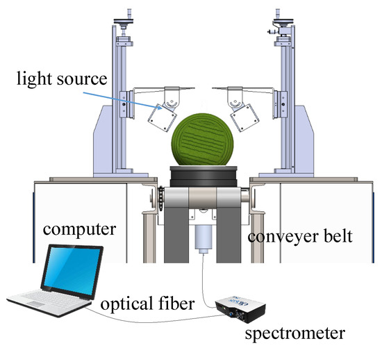 The transmittance spectrum collection system is shown in Figure 2. For large-sized fruit with a thick rind, a higher-powered light source is required to obtain a stable and accurate transmittance spectrum. A total of 10 halogen lamps (150 W, 15 V) were symmetrically arranged on both sides of the conveyor belt. No damage to the watermelon caused by the light was observed during the experiment within an integration time of 500 ms. Spectral information was collected and recorded using a spectrometer (QE65PRO, Ocean Optics, Orlando, FL, USA) with a resolution of 0.74 nm through an optical fiber. The transmittance spectrum was collected at 630–1000 nm with 501 wavelength points. Transmittance spectroscopy can capture comprehensive internal information of the watermelon, and in this study, spectra were collected only once for each sample. The raw spectra acquired without pre-processing were used for subsequent model establishment.