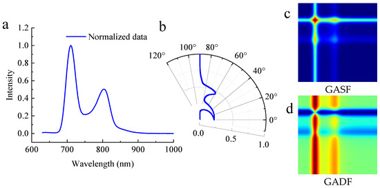 It can be seen that the encoding position moves from the upper left of the matrix to the lower right corner. To further explain the GAF process, Figure 3 is provided as an example using the transmittance intensity spectrum. The raw normalized spectrum has two distinct intensity peaks (Figure 3a), with the first peak being larger than the second. The two peaks in the polar coordinate of Figure 3b correspond to the spectral peaks, where the first peak in Figure 3a (with an intensity of 1) corresponds to a polar angle of 0°.