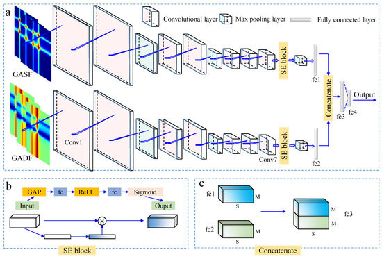 The Squeeze-and-Excitation (SE) block, being added behind the last convolutional layer of the CNN, can enhance the network’s focus on important features by adaptively adjusting the weights of the channels, thus improving the model classification performance [35]. As shown in Figure 4b, SE first performs a global average pooling (GAP) on the different channel features of the input. The weight of each channel of the feature layer is then fixed between 0 and 1 by taking a Sigmoid after two fully connected layers (fc). The output layer is finally obtained by multiplying the weight value with the corresponding input layer.