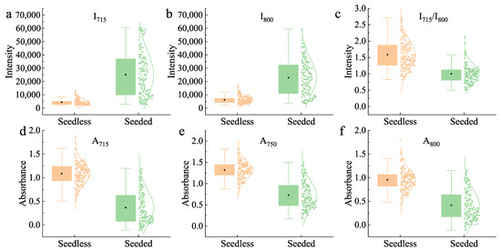 Spectra difference between seedless and seeded watermelon: (a) Intensity at 715 nm, (b) Intensity at 800 nm, (c) Intensity ratio, (d) Absorbance at 715 nm, (e) Absorbance at 750 nm, (f) Absorbance at 800 nm.