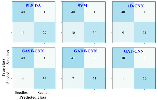 This study explored the classification results of seedless and seeded watermelons based on one-dimensional spectral data. As shown in Figure 7, PLS-DA and SVM achieved classification accuracies of 85.2% and 86.4% for the prediction set in distinguishing seedless and seeded watermelons, with better performance for classifying seedless watermelons. Compared to PLS-DA and SVM, 1D-CNN provided a slight improvement in classification, with an accuracy of 87.7% in the prediction set. Due to the significant similarity and overlap in the one-dimensional spectral data of seedless and seeded watermelons, the classification performance was unsatisfactory. The models struggled to meet the practical requirements for online classification, resulting in a considerable number of misclassifications between seedless and seeded watermelons.