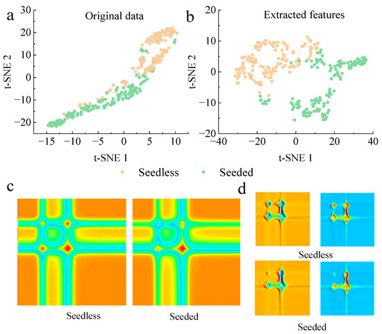 Figure 8a,b shows the visualization result of the original transmittance spectra and the features extracted by the fully connected layer (i.e., fc3) of seedless and seeded watermelons in the calibration set, after being mapped into two-dimensional space using t-SNE. While the original spectral data showed a good clustering effect for the watermelons, there was no clear classification boundary, and some samples overlapped and mixed with each other. The features extracted by fc3 showed a clearer distinction between the seedless and seeded watermelons, significantly increasing the separation distance between the different samples.