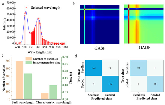 The independent samples, including 17 seedless and 20 seeded watermelons, were used for model validation. The original transmittance spectra in the validation set are shown in Figure 11a. Although originating from different sources, the watermelons spectra were similar, with a higher average spectrum of seeded watermelons. With spectral data extracted by CARS, the generated GASF and GADF images were used as the input of the established CARS-GAF-CNN model, and the classification results are shown in Figure 11b. The classification accuracy of the CARS-GAF-CNN for the validation set of seedless and seeded watermelons was 91.9%. This satisfactory result shows that the developed model is robust to classify multi-cultivar watermelons of different origins.