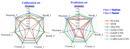 Figure 10 shows the classification result for the calibration and prediction sets of the seven models used in this study. The evaluation metrics were calculated as described in Section 2.6. Models based on GAF images outperformed those based on one-dimensional spectra. After applying CARS variable extraction, a lower generation time of GAF images using fewer wavelengths could be achieved, and the classification accuracy for seedless and seeded watermelons was improved at the same time. Therefore, CARS-GAF-CNN was the optimal model for watermelon classification in this study.