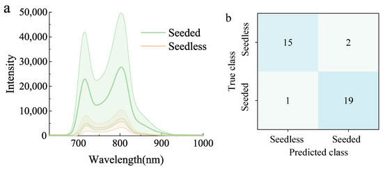 The results of transmittance spectra (a) and model classification (b) of seedless and seeded watermelons in the validation set.