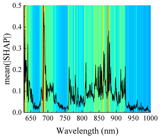 In this study, the global mean absolute SHAP value for watermelon classification was calculated from the full spectra (501 wavelength points) in the prediction set, reflecting the feature importance of each wavelength in the model. The higher the value, the more important it is. As shown in Figure 12, the SHAP values are higher around 630 nm, 675–720 nm, and 800–925 nm, indicating that the intensities in these bands contribute more to watermelon classification. The feature wavelengths extracted by CARS (as shown in Figure 9a) are also mostly included in this range, further demonstrating the effectiveness of the features extracted by CARS.