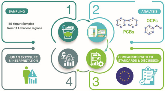 The objective of this article is to investigate the presence of six PCB congeners (PCB 28, 52, 101, 138, 153, and 180) and a range of OCPs, including (hexachlorobenzene (HCB), alpha-hexachlorocyclohexane (α-HCH), beta-hexachlorocyclohexane (β-HCH), gamma-hexachlorocyclohexane or Lindane (γ-HCH), Dichlorodiphenyltrichloroethane (DDT), Dichlorodiphenyldichloroethylene (DDE), Dichlorodiphenyldichloroethane (DDD), endosulfan, methoxychlor, and dieldrin in yogurt samples from across Lebanese regions, and to evaluate their potential contribution to dietary exposure. The analysis was conducted using gas chromatography. The research is designed to tackle a major gap in national food safety surveillance and provides critical insight into the contamination risks associated with dairy consumption in Lebanon, a country currently grappling with major challenges and declining progress toward SDG 2, which aims to eradicate hunger, ensure food security, improve nutrition, and promote sustainable agriculture. An overview of the study’s methodological workflow is presented in Figure 1, outlining key steps including sample collection and preparation, contaminant quantification using GC/ECD and GC/MS, and comparison with international safety standards, primarily the European Union (EU) Commission Regulation limits, in the absence of nationally adopted thresholds for PCBs and OCPs contamination. This is followed by exposure and risk assessment, and concludes with result interpretation.