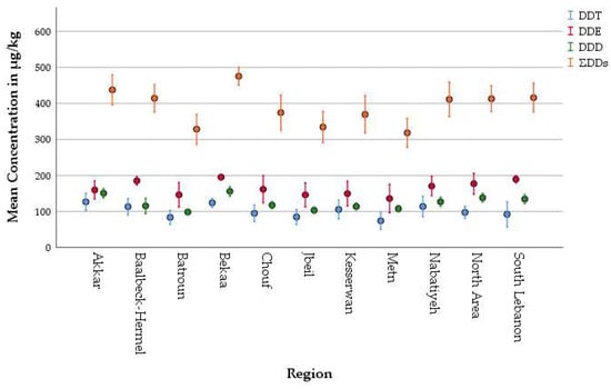 Mean, SEM, and 95% Confidence Intervals for the various ΣDDTs Concentrations Means (μg/kg on fat basis) across different Lebanese regions.