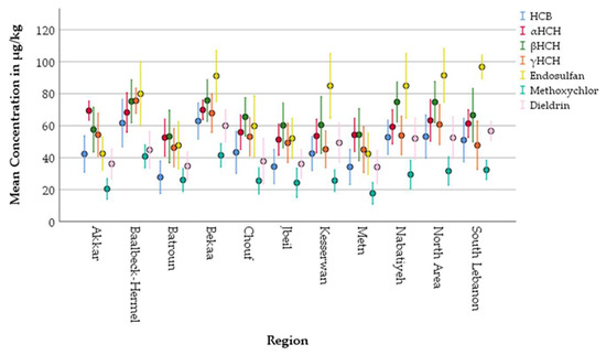 OCP Concentration Means (μg/kg on fat basis) across different Lebanese regions.
