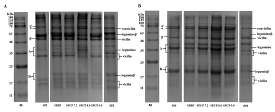 The protein subunit compositions in SPI, PPI, SPBP and SPCP were analyzed via non-reducing and reducing SDS-PAGE. In general, the β-conglycinin subunits in SPI are primarily made up α (~68 kDa), α′ (~72 kDa), and β (~52 kDa), while the glycinin fraction includes an acidic subunit A (~35 kDa) and a basic subunit B (~20 kDa) [19]. The vicilin subunits in PPI are mainly composed α + β (~33 kDa) and α + β + γ (~50 kDa), and the legumin fraction consists of α (~40 kDa), β (~20 kDa), and α + β (~60 kDa) [20]. As shown in Figure 1A, under nonreducing conditions, both SPBP and SPCP exhibited typical bands of protein subunits that had been observed in SPI and PPI, suggesting that the major subunits from these proteins were present in the blended and co-precipitated proteins. Comparable findings were observed for tilapia-soybean protein co-precipitates [21]. Compared with SPI and PPI, protein bands of SPBP and SPCP were enhanced at the top of the electrophoretic, especially SPCP8.0, indicating that the presence of large molecular weight soluble protein in SPBP and SPCP. As shown in Figure 1B, Compared with SPBP, the intensities of the bands of α′, α, β, convicilin, vicilin, legumin α and legumin β subunits in SPCP were enhanced. This might result from stronger non-covalent caused by the co-precipitation of proteins from different sources [22]. Compared with the non-reducing electrophoresis, the bands at the top of SPBP and SPCP were weakened dramatically. This could be because adding DTT reduced the disulfide bonds between protein molecules, loosening their structure and causing the protein subunits to dissociate [23]. In summary, both SPBP and SPCP retained all the subunits present in the structure of SPI and PPI, while the co-precipitation treatment markedly strengthened the interactions of protein subunits.