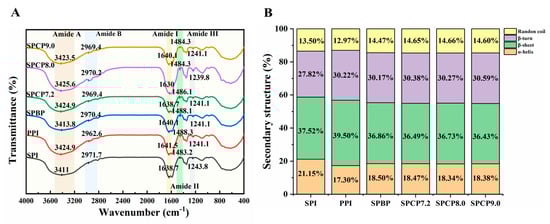 Changes in the secondary structure of proteins can be observed using FTIR spectra. In Figure 2A, the amide A band in the range of 3200–3500 cm−1 was related to N-H stretching vibrations due to hydrogen bonding. The amide B band observed at 2970 cm−1 corresponded to C-H stretching. Meanwhile, the amide I and II bands associated with C=O stretching vibration, N-H bending, and C-N stretching were positioned at 1638 cm−1 and 1484 cm−1, respectively. At 1240 cm−1, the amide III band was linked to the bending of C-N and N-H [24]. The above characteristic peaks of SPBP and SPCP described were similar to those of SPI and PPI. However, the peak intensities of amide A, amide II, and amide III bands in SPCP8.0 were markedly stronger than those in the other proteins, and the amide B and amide I bands showed red-shifts. This might be due to the pH shift from alkaline to neutral, during which SPI and PPI underwent unfolding and refolding. This process allowed the hydrophobic groups originally buried within the molecule, to become more readily exposed and participate in interactions between the two proteins. Meanwhile, these structural alterations encouraged the creation of more intermolecular hydrogen bonds, which in turn strengthened both hydrogen bonding and hydrophobic interactions in the co-precipitated protein [25].
