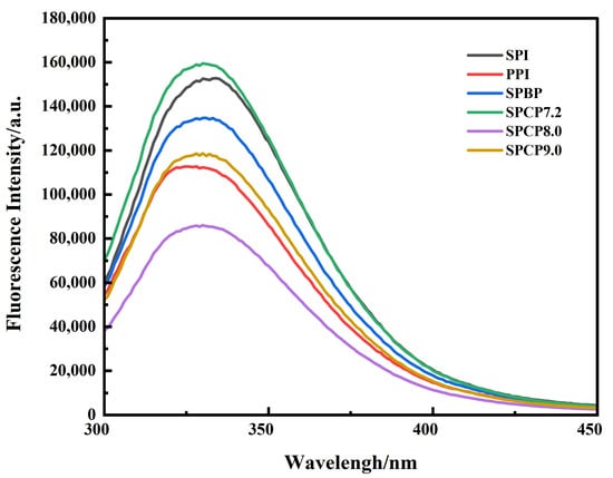 Intrinsic fluorescence spectroscopy is an effective indicator for probing tertiary structural changes in proteins [27]. In Figure 3, all samples exhibited varying fluorescence intensities at approximately 330 nm (the characteristic emission maximum of Trp residues). Among them, SPI exhibited a slight red-shift, PPI showed a slight blue-shift, while SPBP and SPCP showed no obvious variation. SPCP exhibited lower fluorescence intensity compared to SPBP (except for SPCP7.2). The observed difference might have resulted from stronger non-covalent interactions in the co-precipitated proteins. Wang, et al. [28] similarly observed decreased fluorescence intensity during the preparation of pine kernel protein–egg white protein co-precipitates. Meanwhile, the process of tuning the co-precipitated proteins back to neutrality from basicity, protein structure underwent rearrangements that not only reburied the tryptophan residues, but also changed their microenvironment, leading to a static fluorescence quenching [29]. In contrast, SPBP was merely a simple blend of SPI and PPI, in which the two proteins maintained their original conformations, leading to minimal changes in the microenvironment of Trp. Therefore, the fluorescence intensity of SPBP fell between those of SPI and PPI.