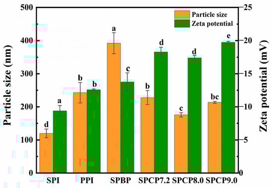In Figure 4, the average particle size of PPI (242.9 nm) was larger than that of SPI (120 nm). SPBP (392.2 nm) exhibited the largest average particle size. In contrast, the average particle sizes of SPCP7.2 (228 nm), SPCP8.0 (176.1 nm) and SPCP9.0 (213.5 nm) were significantly smaller than that of SPBP. Some studies had demonstrated that protein–protein molecule interactions could reduce the particle size of protein samples [30]. During the co-precipitation process, interactions between SPI and PPI promoted closer packing of protein molecules, thus reducing the particle size of SPCP. In addition, SPBP showed weak intermolecular interactions and a looser structure, leading to a larger average particle size. The results of zeta-potential further supported this conclusion. The absolute values of the zeta-potential of SPCP7.2 (−18.3 mV), SPCP8.0 (−17.4 mV) and SPCP9.0 (−19.7 mV) notably greater than those for SPI, PPI and SPBP (−13.7 mV) samples. This demonstrated that co-precipitation increased the surface charge density of protein molecules and enhanced electrostatic repulsion, thereby promoting orderly molecular packing through optimized protein–protein interactions and consequently maintaining smaller and more uniform particle sizes [31]. These characteristics make SPCP particularly advantageous for food applications requiring uniform texture and optimized functionality, such as plant-based meat products.
