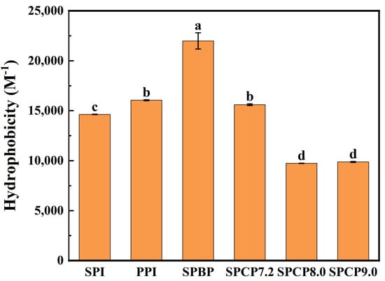 Hydrophobic amino acids on the side chains of a protein determine its H0, and an appropriate H0 is crucial for the protein’s solubility and functional characteristics (such as gel-forming ability) [32]. As shown in Figure 5, the H0 of PPI was greater than that of SPI, SPBP (21,987.3) exhibited the highest H0, whereas SPCP7.2 (15,607.3), SPCP8.0 (9744.8) and SPCP9.0 (9875.5) displayed significantly reduced H0 compared with SPBP. This may be attributed to hydrophobic interaction-driven co-assembly between SPI and PPI during co-precipitation process, which led to the burying of previously exposed hydrophobic residues inside the proteins again, thereby forming a more stable molecular structure. In addition, the phenomenon in which interactions between heterologous proteins bury hydrophobic groups was known as “hydrophobic collapse” [33], which was particularly prominent in SPCP8.0 and SPC9.0. In contrast, SPBP exhibited the highest H0, which might have originated from the SPBP being simply a mixture of SPI and PPI, where the constituent proteins retained their native conformations. It not only preserved the relatively large number of hydrophobic amino acids (such as phenylalanine and leucine) on the surface of PPI but also prevented a decrease in the exposure of hydrophobic groups due to interactions, resulting in its highest H0 [34].
