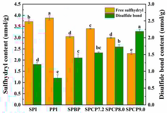 The content of -SH and S-S in soy-pea blended and co-precipitated proteins. Note: significant differences between samples are marked by different letters (p < 0.05).
