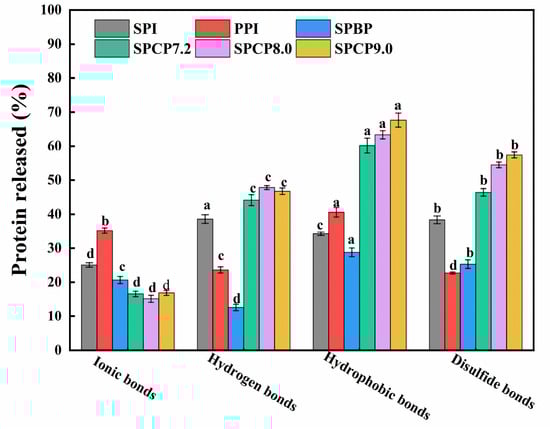 In order to shed light on the interaction force between SPI and PPI, this study examined the types of protein–protein interactions. Specifically, ionic bonds, hydrogen bonds, hydrophobic interactions, and disulfide bonds were disrupted by NaCl, urea, SDS, and DTT, respectively [38]. As shown in Figure 7, hydrophobic interactions, hydrogen bonds, and S-S played dominant roles in stabilizing the SPCP structure. In contrast, SPBP exhibited significantly weaker intermolecular interactions. Compared with SPI, PPI, and SPBP, SPCP showed significantly enhanced hydrophobic interactions, which might be attributed to the optimal spatial matching of hydrophobic regions between SPI and PPI during co-precipitation. This matching maintained the intramolecular hydrophobic core and promoted intermolecular hydrophobic packing, synergistically enhancing hydrophobic interactions. Additionally, the increased proportion of hydrogen bonds in SPCP indicated that it not only retained the native hydrogen bond network of SPI but also formed new intermolecular hydrogen bonds with PPI. Meanwhile, the formation of S-S further stabilized the SPCP structure, which was consistent with the -SH and S-S analysis results, confirming the conversion of partial -SH into S-S during co-precipitation. However, ionic bonds were weaker in SPCP, likely due to the overall negative charge of the system under pH regulation (in Figure 4), resulting in electrostatic repulsion that inhibited the formation of ionic bonds. By contrast, SPBP exhibited weaker intermolecular interactions. This phenomenon might be attributed to the electrostatic repulsion between negative charges of SPI and PPI. This repulsion prevented close intermolecular contact, limiting the exposure of functional groups (e.g., hydrophobic residues and -SH) and exert their activity. Consequently, only weak interactions between SPI and PPI (e.g., localized electrostatic interactions and van der Waals forces) were formed rather than stronger hydrophobic interactions, hydrogen bonds, or S-S bonds. This also validated the unique efficacy of co-precipitation technology in synergistically enhancing the structural complementary effects of SPI and PPI through multiple intermolecular forces.