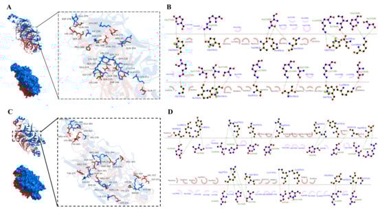 Figure 8A displayed the optimal docking conformation of 7S-legumin (binding energy: −14.5 kcal/mol), where the red 7S protein and blue legumin protein formed extensive contacts. The 2D schematic diagram (Figure 8B) revealed interactions where, on one hand, hydrophobic amino acids such as Ala299, Leu22, Phe245, Tyr278, and Met353 in 7S, and Ser232, Lys251, Arg233, Pro235, and Asn239 in legumin formed extensive hydrophobic interactions that maintained the 3D structure of the complex. On the other hand, hydrogen bonds were formed between Val348, Pro300, and Asn350 of 7S and Asn234 of legumin; Lys149 and Glu224, Ser225; Gln104 and Ser215, Ser216; Thr106 and Lys214, Ala213; as well as between Gln275, Ser297, Gly150, Ile102 and Lys243, Ile236, Lys219, Ser217, respectively. Ranging from 2.62 to 3.30 Å, these hydrogen bonds reinforced non-covalent bond strength and stabilized the complex’s spatial conformation.