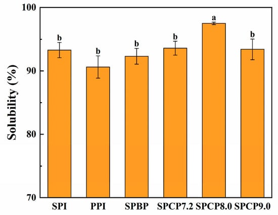 The solubility of proteins is essential for determining their functional properties [42]. As shown in Figure 9, the solubility of SPI (93.26%) was relatively higher than that of PPI (90.60%), and the solubility of SPCP7.0, SPCP8.0 and SPCP9.0 was 93.56%, 97.50%, and 93.39%, respectively, which was slightly higher than that of SPBP (92.29%). Among them, SPCP8.0 exhibited the highest solubility. At alkaline environment, SPI and PPI formed a special intermediate state called the molten globule phenomenon due to the solution’s ionic strength. In this state, reduced side-chain interactions increased flexibility and enhanced protein–water binding, thereby improving its solubility [43]. When pH was adjusted back to neutral, the proteins underwent hydrophobic collapse, re-burying hydrophobic residues and redistributing surface polar groups to form a stable structure with high charge density [44], as evidenced by the significantly increased zeta-potential absolute values in Figure 4, indicating enhanced intermolecular electrostatic interactions. This strengthened hydration (ion-dipole interactions) and further improved solubility. These findings were in agreement with Zhang, et al. [45], who reported higher solubility for soy-whey co-precipitated proteins than for single proteins. However, SPCP9.0 might have exhibited increased particle size, which resulted in partial burial of polar groups within the interior, consequently reducing their interactions with water molecules. In contrast to SPCP, SPBP preserved the native structures of SPI and PPI, in which the proteins were merely associated through weak intermolecular interactions. Thus, it ultimately resulted in inferior solubility enhancement effect being slightly lower than that of SPCP.