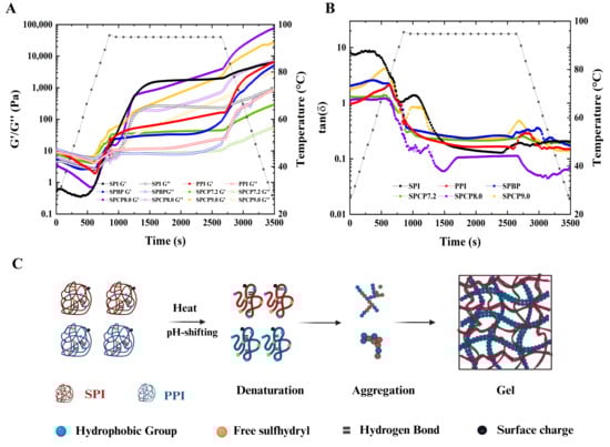 The storage modulus (G′), loss modulus (G″) (A) and loss tangents (tan δ) (B) of soy-pea blended protein and soy-pea co-precipitated proteins, and a schematic representation of gelation (C) of soy-pea co-precipitated proteins.