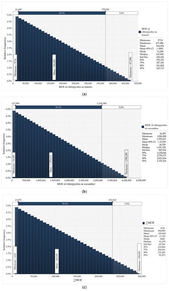 Probabilistic assessment of chronic dietary risk from CPF exposure through consumption of (a) tomato and (b) cucumber, and (c) cumulative chronic risk (∑MOE).