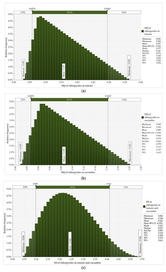 Probabilistic assessment of acute dietary risk from CPF exposure through consumption of (a) tomato and (b) cucumber, and (c) cumulative acute risk (∑HQ = HI).