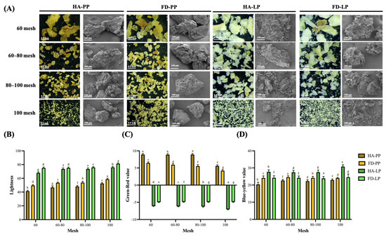 The physical appearance of the peel samples varied notably depending on the drying method employed [32]. As illustrated in Figure 1A, particle morphology changed with different mesh sizes, showing a decrease in particle size with increasing mesh size. Compared to freeze-dried PP powder, freeze-dried LP powder exhibited a broader distribution of particles. This phenomenon is attributable to the structural disintegration induced by freeze-drying of LP, resulting in a brittle and easily fractured matrix [32]. The observed microstructural alterations were closely associated with the drying method. Scanning electron microscopy (SEM) showed surface shrinkage in hot-air-dried samples and numerous porous structures in freeze-dried samples. This aligns with previous studies indicating that hot-air drying causes surface water to evaporate rapidly, leading to case-hardening and subsequent shrinkage [33]. In contrast, freeze-drying effectively removes internal moisture, facilitating the formation of sponge-like, porous three-dimensional networks in both PP and LP [32].