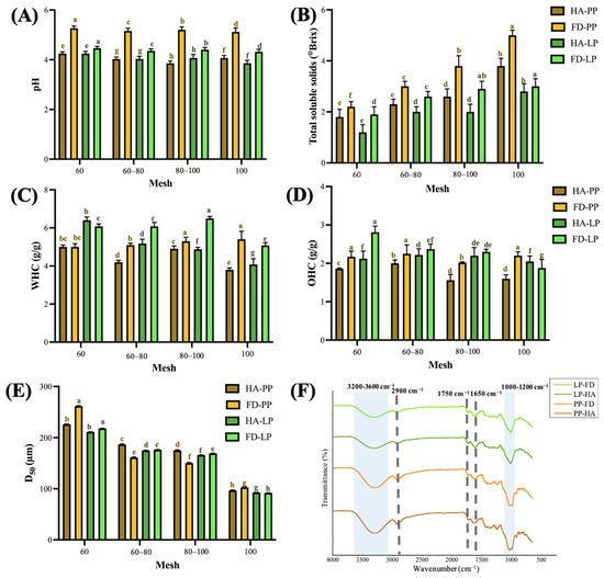 Physicochemical properties of pineapple peel powder and lemon peel powder. (A) pH, (B) Total soluble solids, (C) Water-holding capacity, (D) Oil-holding capacity, (E) Average particle size, (F) Fourier-Transform infrared spectroscope spectrum. Data are presented as means ± standard deviations (n = 3). Different letters (a–h) indicate statistically significant differences in the same group (p < 0.05). PP, LP, HA, and FD denote pineapple peel powder, lemon peel powder, hot-air drying, and freeze-drying, respectively. The sample measured by FTIR was filtered with a 100-mesh sieve.
