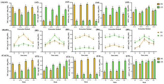 The efficiency of extraction is influenced by particle size, primarily due to its impact on surface area. Figure 3C illustrates that optimal extraction occurred at average particle sizes of 96.6 µm for PPE and 91.7 µm for LPE (p < 0.05). At these particle sizes, total phenolic content (TPC) reached 49.5 and 29.2 mg GAE (100 g DW)−1, while total flavonoid content (TFC) reached 54.7 and 80.6 mg QE (100 g DW)−1. This represents increases of 25.2% and 81.4% in TPC, and increases of 56.04% and 53.67% in TFC, respectively. The DPPH radical-scavenging activity measured 187.4 and 40.0 mg TE (100 g DW)−1, while the FRAP activity was recorded at 21.0 and 48.8 mg TE (100 g DW)−1. Additionally, the ABTS+ activity was 11.6 and 13.0 mg TE (100 g DW)−1, respectively. The results indicate that the application of 100 mesh micropowders led to a significant enhancement in antioxidant activity, with improvements ranging from 11.4% to 156.9% when compared to 60 mesh powders. This finding aligns with the results of Chen et al. [12], which indicated that soybean powders with reduced particle sizes demonstrated significantly elevated total flavonoid contents, with the smallest particle group exhibiting a 28.2-fold increase. This supports the notion that smaller particles enhance the solvent–solute contact area, thereby improving extraction yield and reproducibility [12,52].