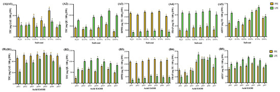 Analysis of functionalities and antioxidant activities of pineapple and lemon peel extracts under different solvents (A) and acidified ethanol (B). All samples were prepared using 100-mesh sieved peel micropowder and extracted for 30 min with ultrasound-assisted extraction, with acidified ethanol in row B prepared using 75% ethanol. (1) total polyphenols, (2) total flavonoids, (3) 2,2-diphenyl-1-picrylhydrazyl radical scavenging, (4) ferric ion reducing antioxidant power, and (5) 2,2′-azino-bis(3-ethylbenzothiazoline-6-sulfonic acid) radical scavenging. Data are presented as means ± standard deviations. (n = 3). Different letters (a–g) indicate statistically significant differences in the same column (p < 0.05). Abbreviation description: PPE and LPE denote pineapple and lemon peel extracts, respectively. EtOH and Acid EtOH denote the samples used for ethanol extraction and acidified ethanol extraction, respectively.