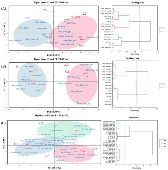 To further elucidate the relationships between extraction parameters and the antioxidant as well as physicochemical properties of PPE and LPE, PCA was performed and complemented by agglomerative hierarchical clustering (AHC) for sample classification. Variables included in the PCA model were particle size, extraction time, pH, TSS, TPC, TFC, and antioxidant (DPPH, FRAP, and ABTS+) activity (Figure 5). For PPE (Figure 4A), the first two principal components (F1 and F2) explained 52.13% and 23.93% of the total variance, respectively, accounting for a cumulative contribution of 76.06%. AHC grouped the samples into two distinct clusters. Cluster 1 (C1) primarily consisted of samples extracted for 10, 20, 40, and 50 min, with larger particle sizes and pH 1-acidified ethanol, which showed higher TSS levels and were distributed on the left side of the PCA plot. Cluster 2 (C2) included samples extracted for 30 min with smaller particle sizes and pH 2–7-acidified ethanol, characterized by higher TPC, TFC, and antioxidant activities, and located on the right side of the PCA plot. These findings indicate that extraction time and polyphenol yield do not exhibit a strictly linear relationship [57]. Overall, extraction time and pH, particularly within the 80–100 mesh screen, were the most influential variables affecting the antioxidant potential of PPE.
