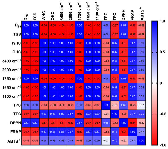 The data of HA-PP and HA-LP samples that passed through the 100-mesh sieve were integrated and subjected to Pearson correlation analysis. In Figure 6, D50 exhibited a strong positive correlation with DPPH radical-scavenging activity (r = 0.87) and an equally strong negative correlation with TFC and FRAP reducing power (r = −0.87 for both). These findings indicate that smaller particles facilitate flavonoid extraction and enhance FRAP performance by increasing the solvent–solute contact area, whereas larger particles may still retain phenolic acids that preferentially contribute to DPPH activity [13]. TSS was correlated positively with DPPH activity (r = 0.87) but negatively with FRAP and TFC (both r = −0.87), suggesting that the compounds responsible for TSS differ structurally from those driving flavonoid-associated antioxidant effects, thus highlighting the selective extraction behavior. WHC and OHC showed positive correlations with TFC and FRAP (r = 0.87), implying that these physical properties promote the retention and extraction of flavonoids possessing amphiphilic characteristics and, consequently, enhance physiological functionality.