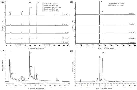 HPLC chromatograms of phenolic acids (A) and flavonoids (B) standards and phenolic acid in pineapple peel extracts (C) and polyphenol in lemon peel extracts (D). The samples used in (C) were prepared using 100 mesh peel powder and extracted for 30 min using ultrasound-assisted extraction with 75% acidified ethanol (pH 5), and those used in (D) were prepared using 100 mesh peel powder and extracted for 30 min using ultrasound-assisted extraction with 75% acidified ethanol (pH 4).