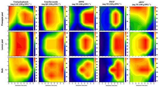 Contour plots of antioxidants and their capacities within different pH solvents and extraction time on pineapple peel, lemon peel, and both extracts. All peel micropowder was filtered through a 100-mesh sieve.